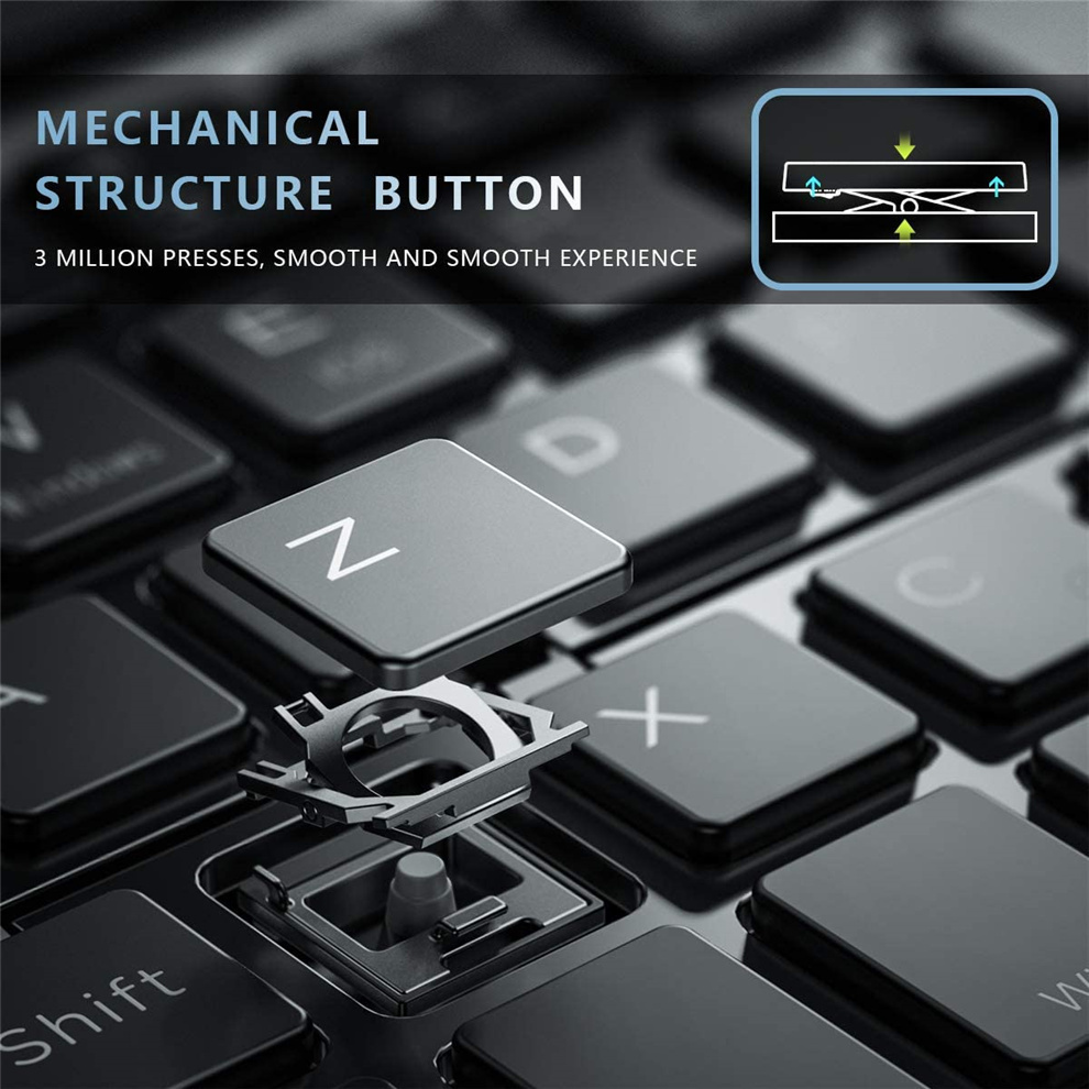 Auto Wake / SleepSensitive magnetic induction, automatic wake up and sleep to save energy. Only 2-3 hours of full charge, enough to work for 40 hours or 180 days for standby. Perfect for your short business trip. Responsive Scissor-Switch KeysFeaturing scissor-switch key structure, which used in all modern laptops, provides noiseless, crisp and comfortable typing. Every key is expertly engineered to last for more than 3,000,000 keystrokes, giving you long term reliability. Multi-system CompatibleThe Bluetooth keyboard works seamlessly with iOS, Android and Windows. Maintain a stable connection and provides fast response to devices within 10 meters of operation. 1. Compact and Portable: The folding design reduces the width of the fuselage to 55mm.